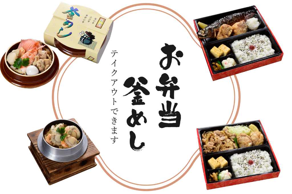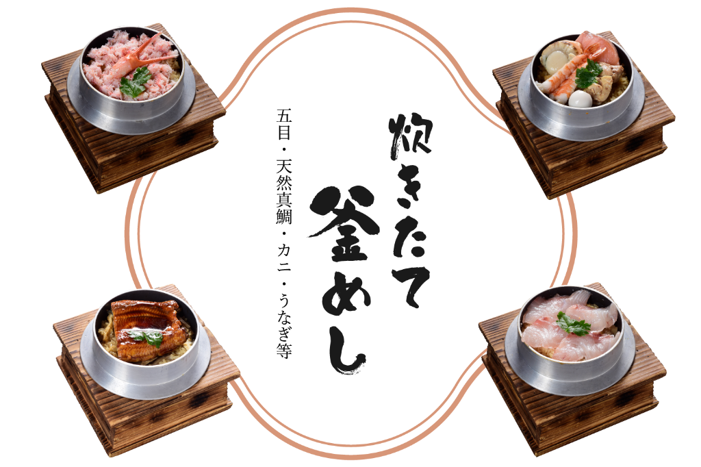 自慢の五目釜飯はご注文いただいてから店内で炊き上げ、少々お時間を頂いてしまいますが炊き立てふっくらで、香りとともにお楽しみいただけます。